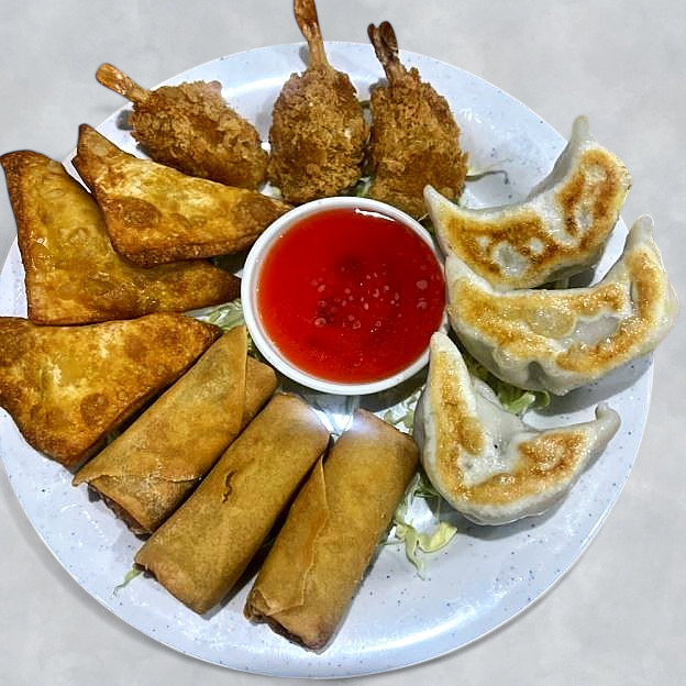Egg Rolls (3), Fried Prawns (3), Fried Crab Wonton (3), Pot stickers (3).