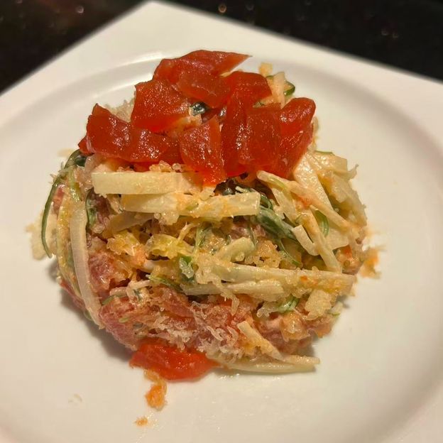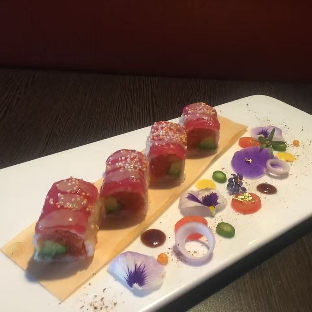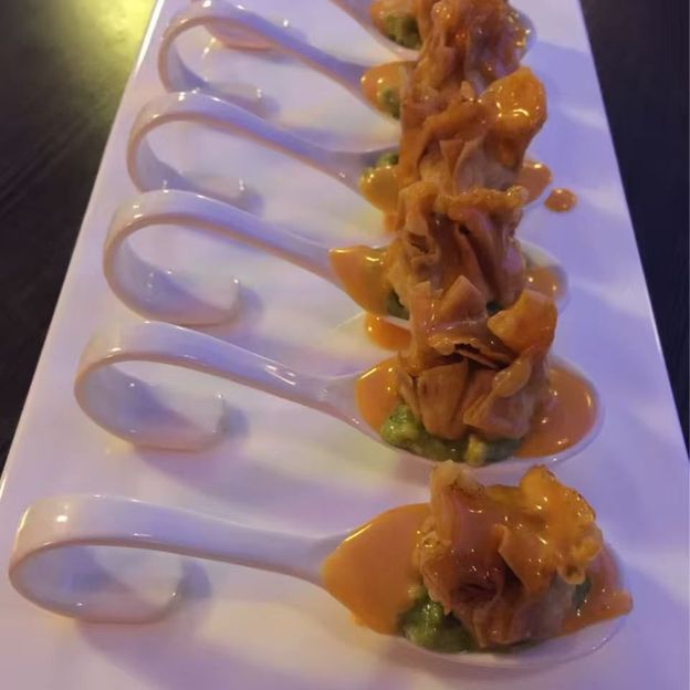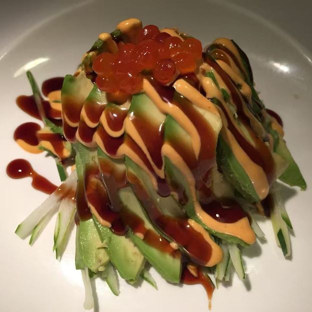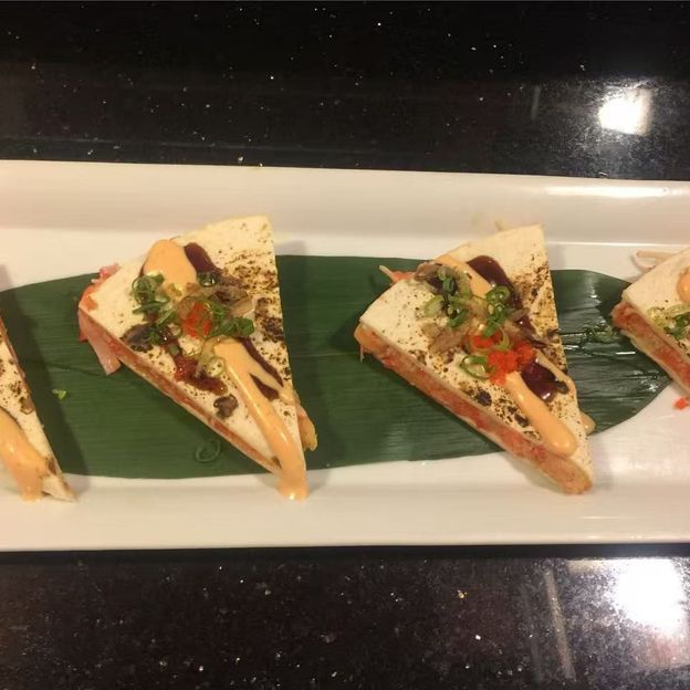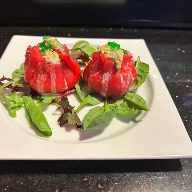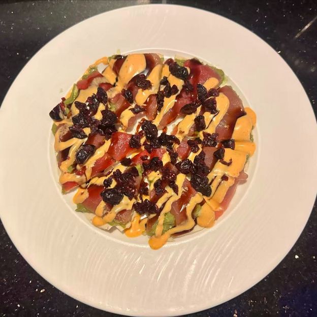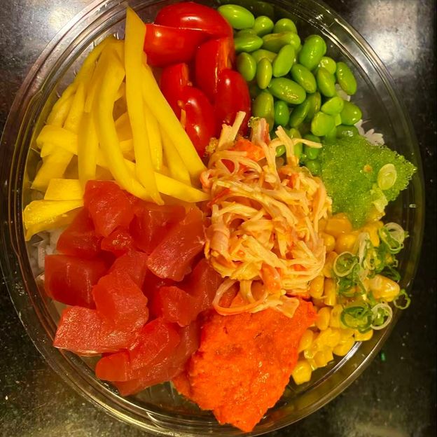 Spicy tuna,tuna,mango,edamame,sweet corn,cherry tomato ,kani salad,green onion and wasabi caviar