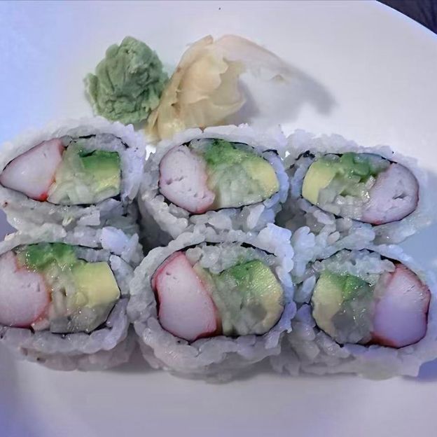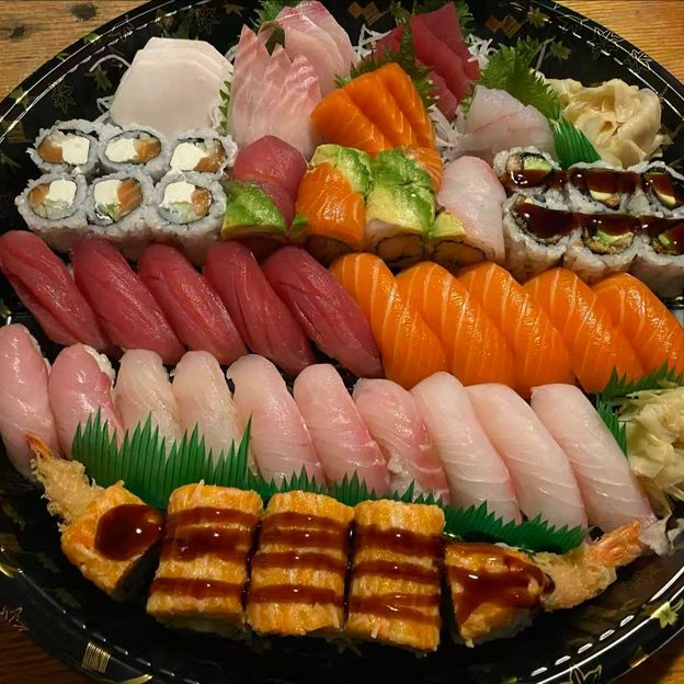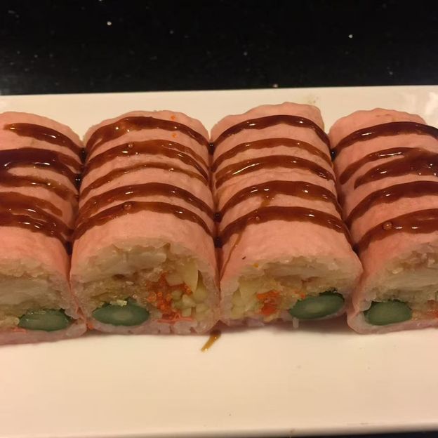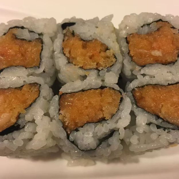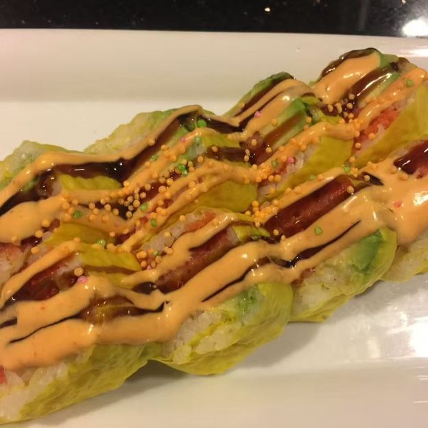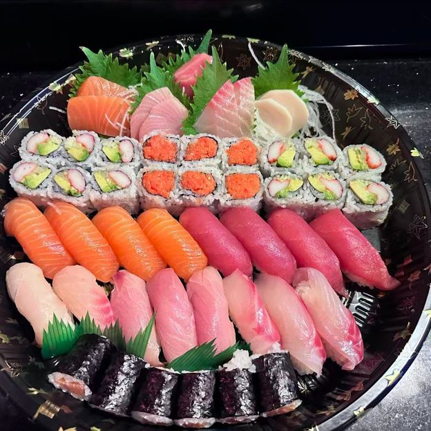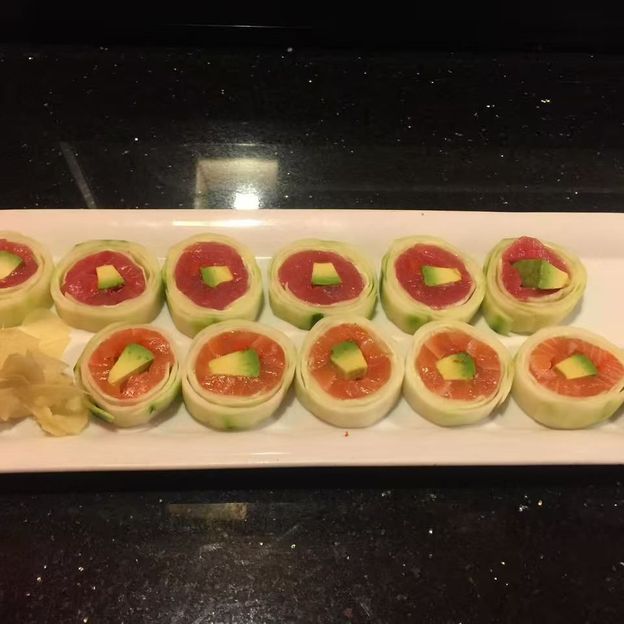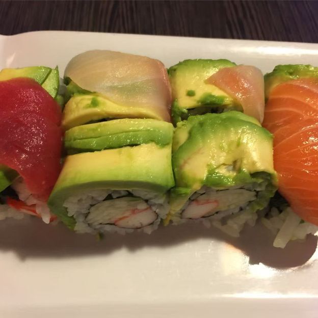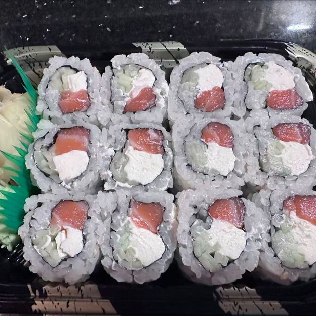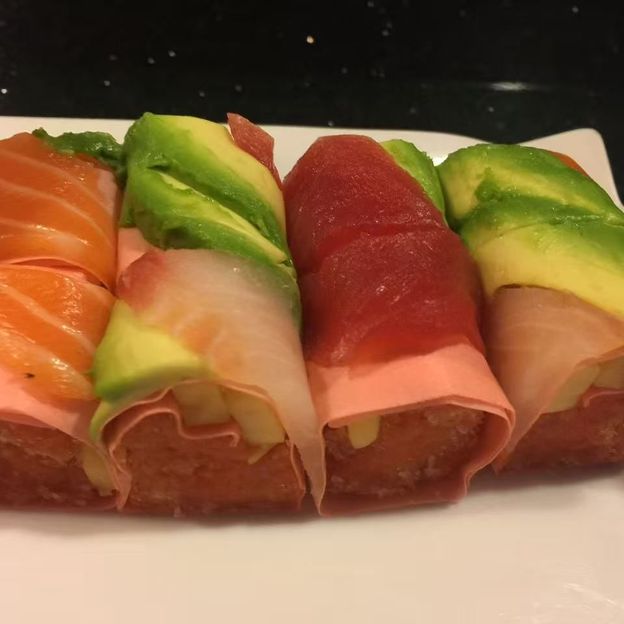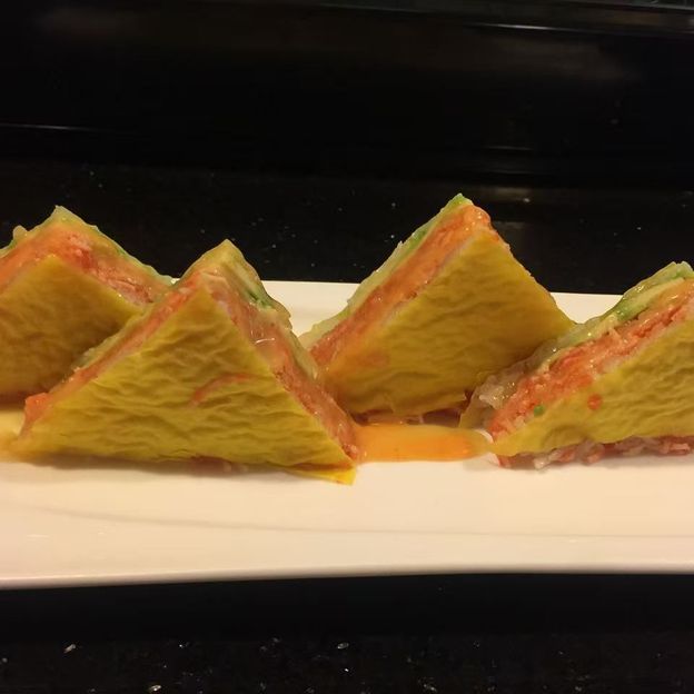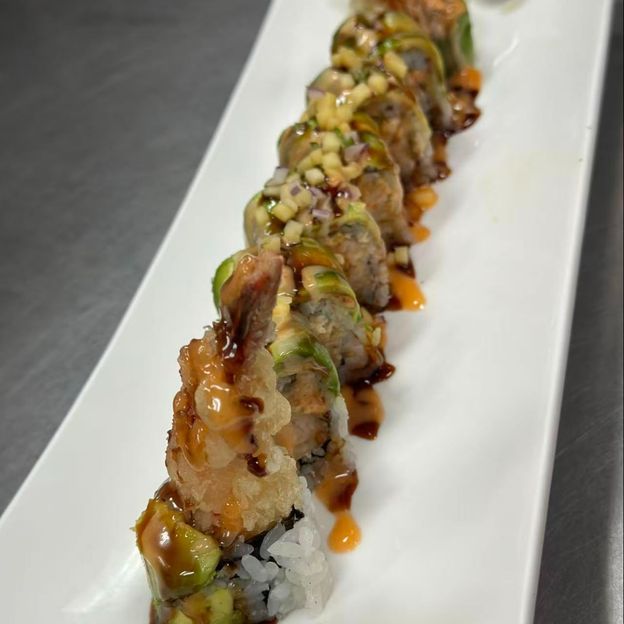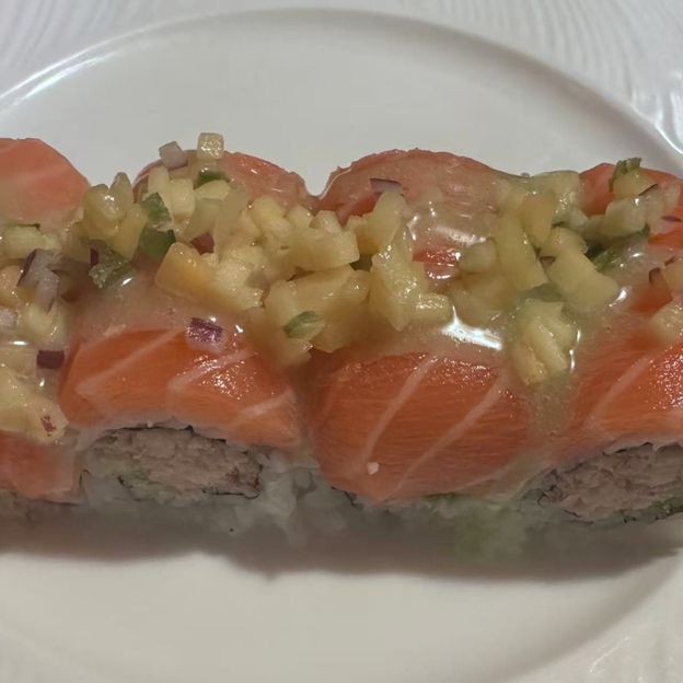 Tuna, salmon, yellowtail, mango, cucumber, pineapple, kani salad, seaweed salad, green onion and roasted seaweed