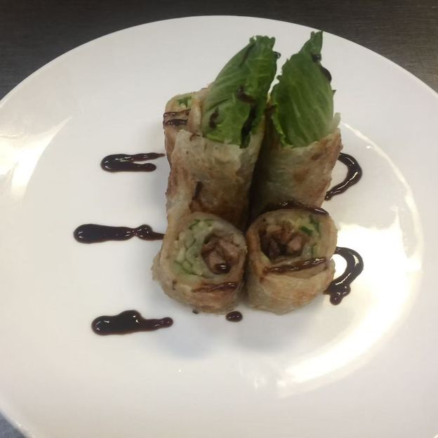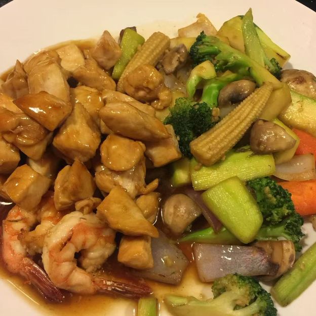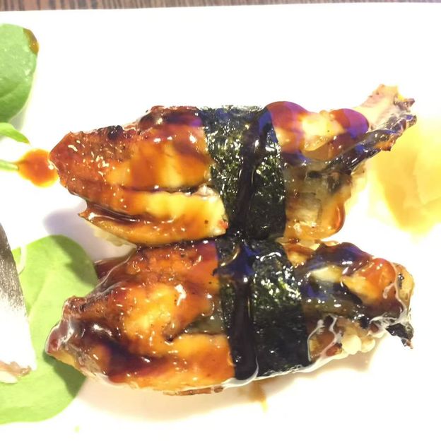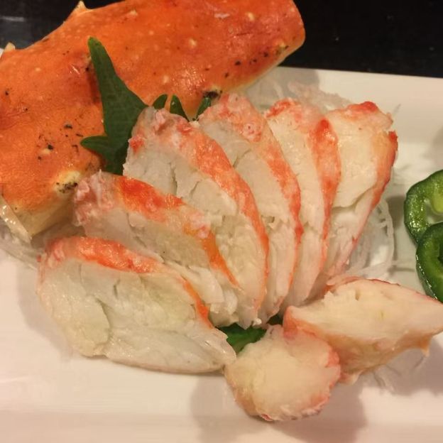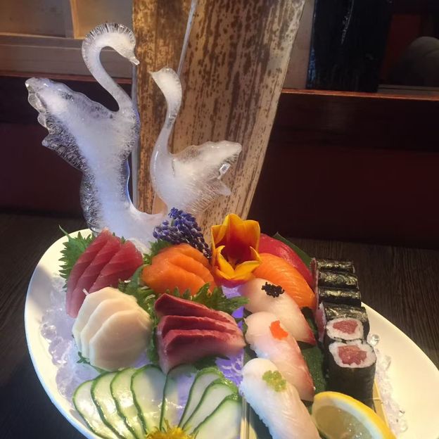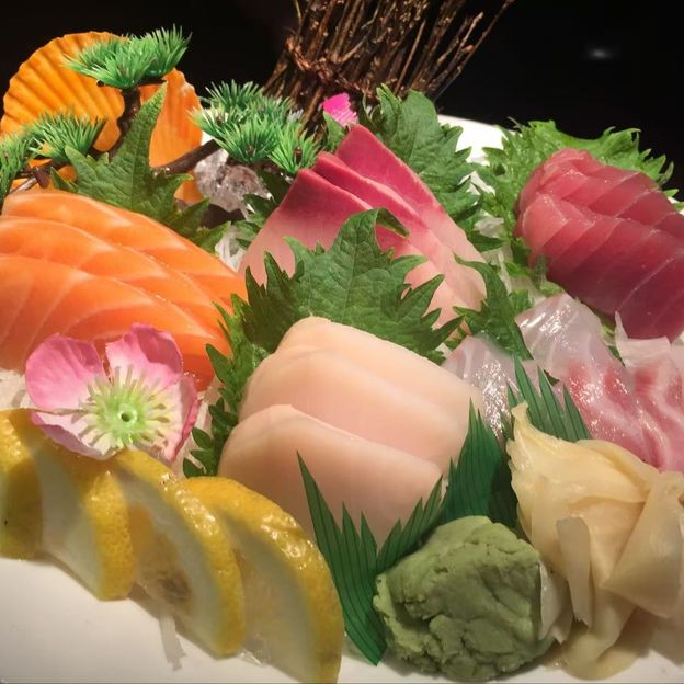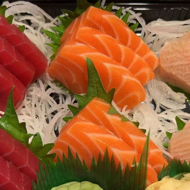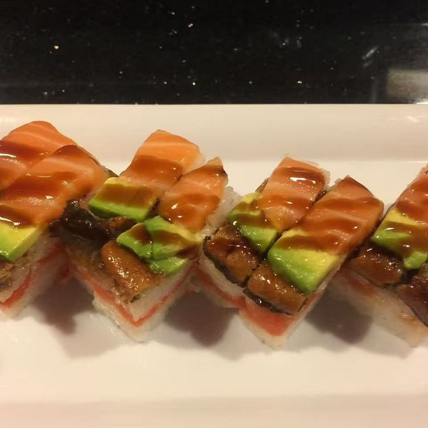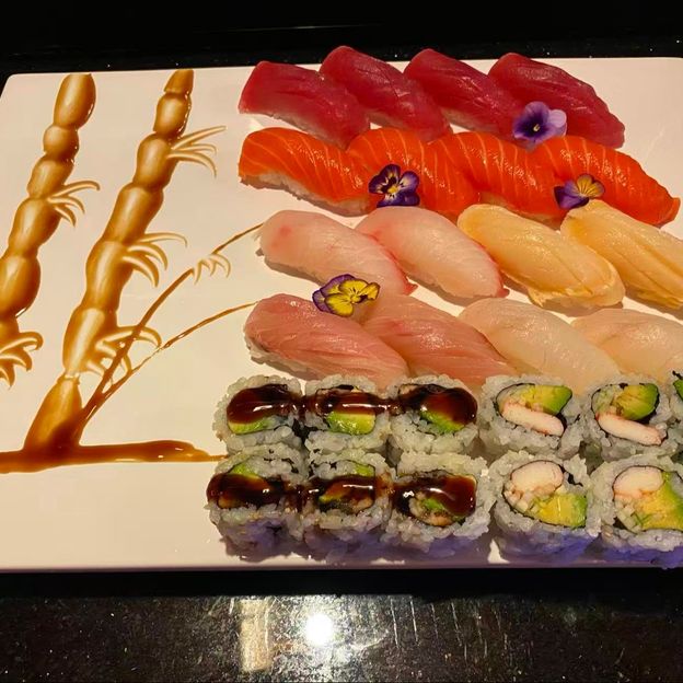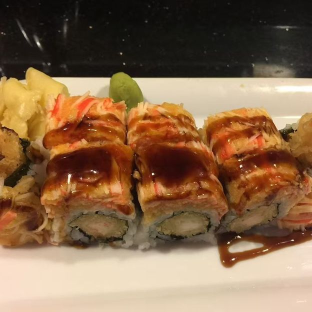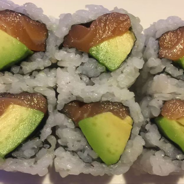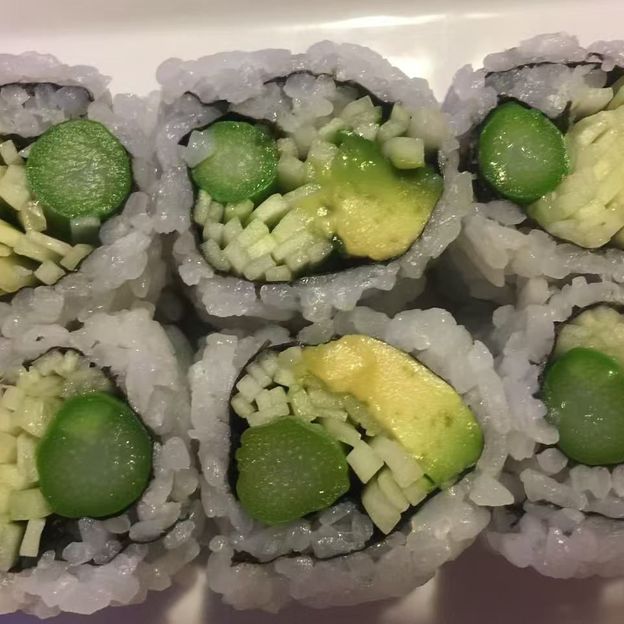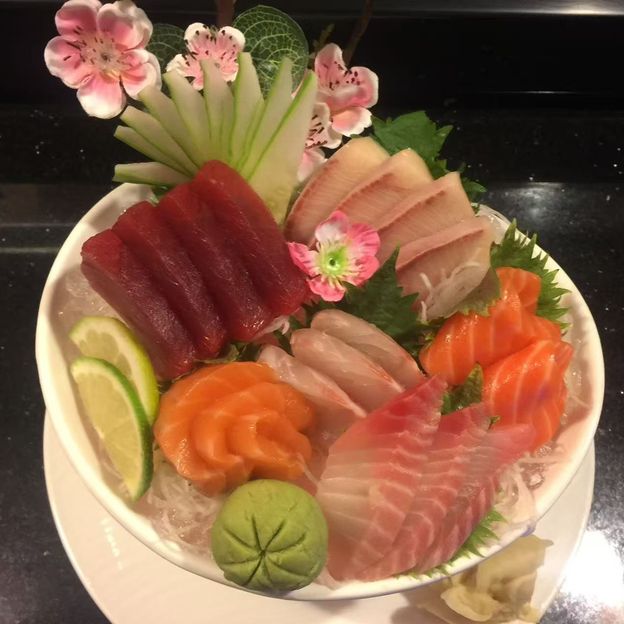 Tuna, salmon, yellowtail, mango, cucumber, pineapple, kani salad, seaweed salad, green onion and roasted seaweed
