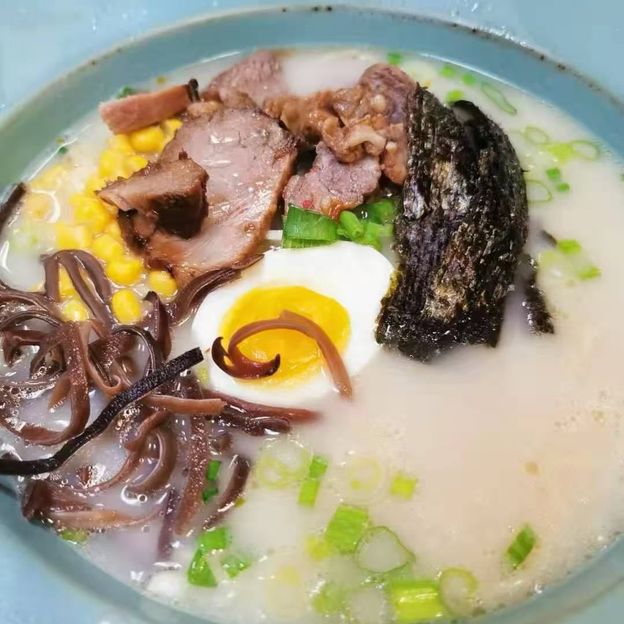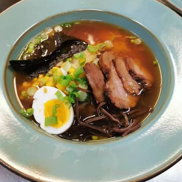 Vegetarian ribs, tofu, shiitake mushroom, sweet corn, edamame, cucumber, avocado, red cabbage, green onion and sunflower seeds