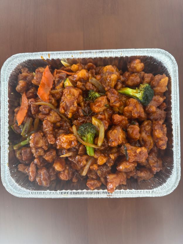 Crispy chucks chicken with tasty brown sauce with sesame seeds.