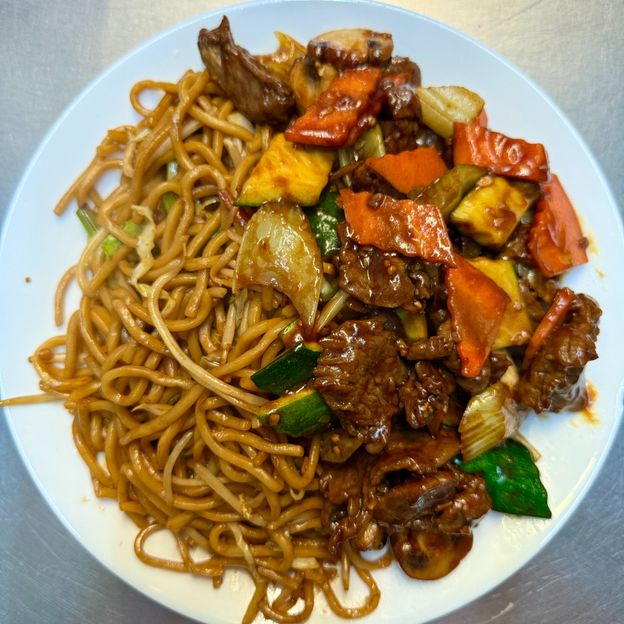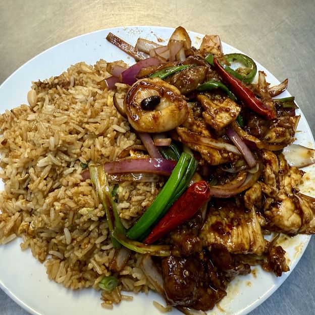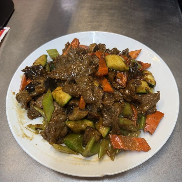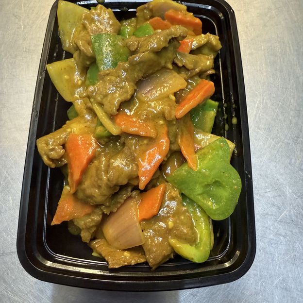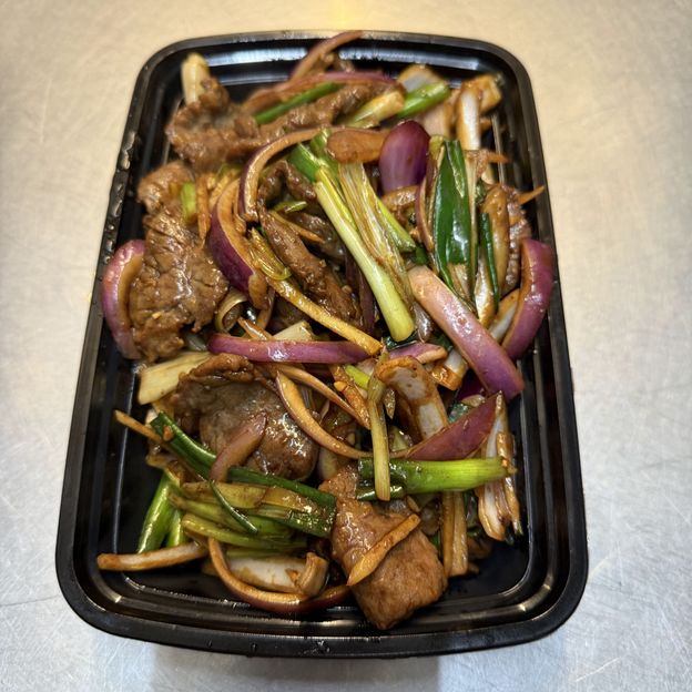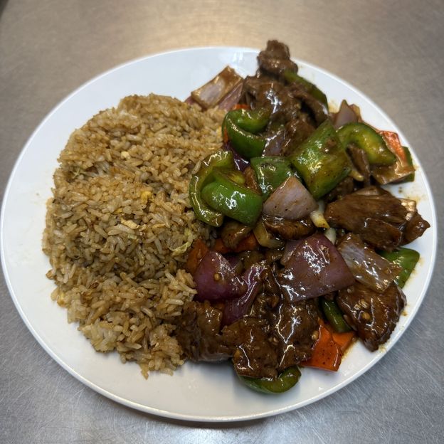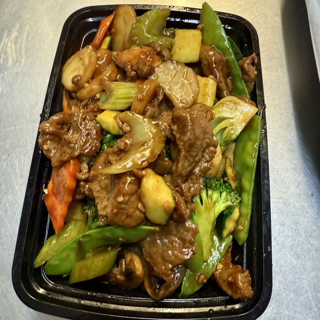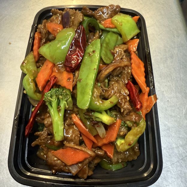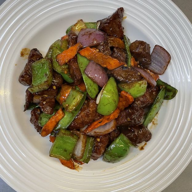 chel's special sauce,cubed tenderloin beef with Snow bean red onion carrot and pepper
