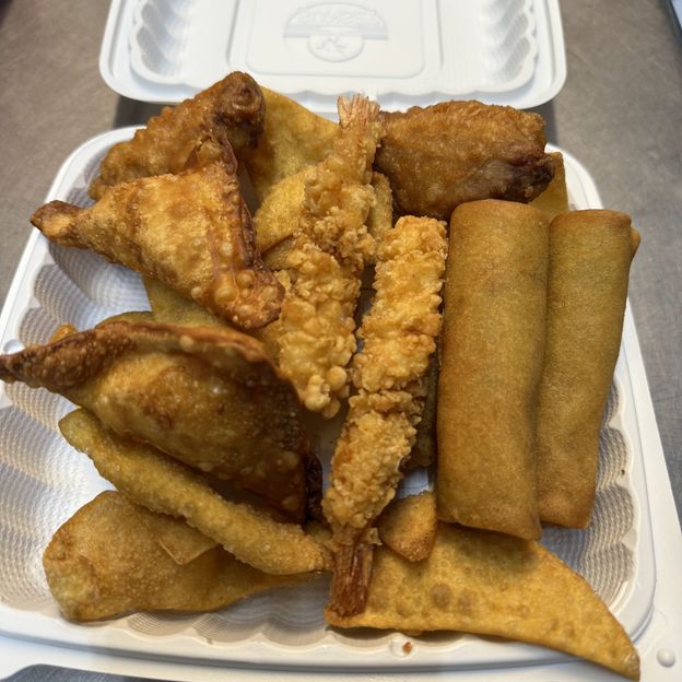 two Egg Rolls,Two Fried Chicken Wings,Fried Wonton Shin,And Two Fried Shrimps And Fried Crab Horns