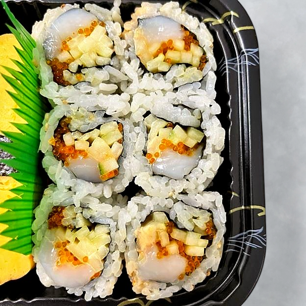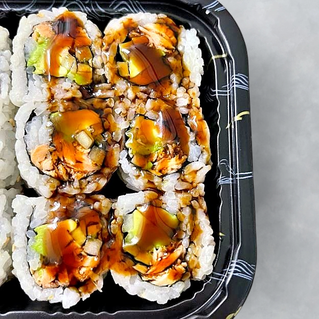 65 pieces. Includes spicy tuna maki, Alaskan maki, Red Sox maki, black widow maki, spicy escolar maki, crazy maki, avo-kyu maki, California maki, caterpillar maki, and crazy tuna maki.