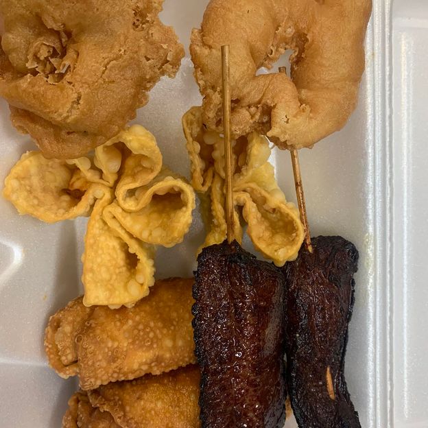 2 egg roll, 2 crab meat rangoon, 2 teriyaki beef stick, 2 fried shrimp.
