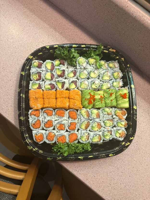 12 PCS California, 12 pcs Alaskan roll, 12 pcs spicy salmon,12 pcs spicy tuna,8 pcs spicy girl, 8 pcs Godzilla roll