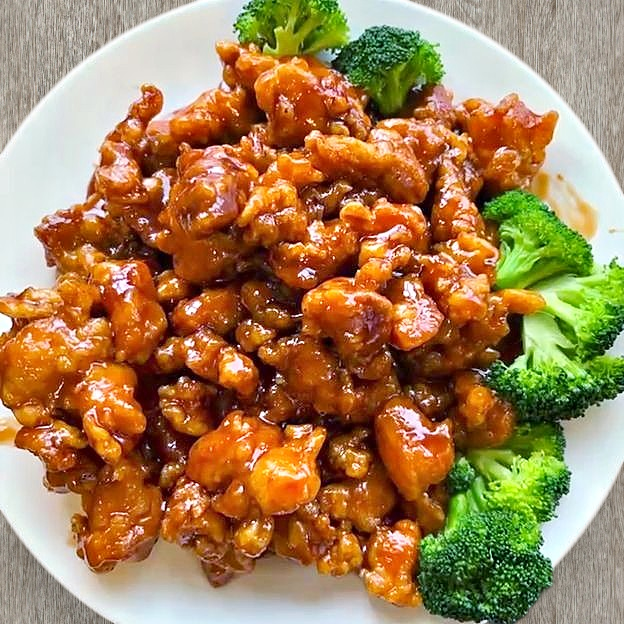 Breaded deep fried cooked w.orange peel in spicy special sauce