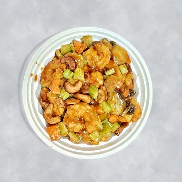Celery, carrot, mushroom, water chestnut and cashew nuts in brown sauce