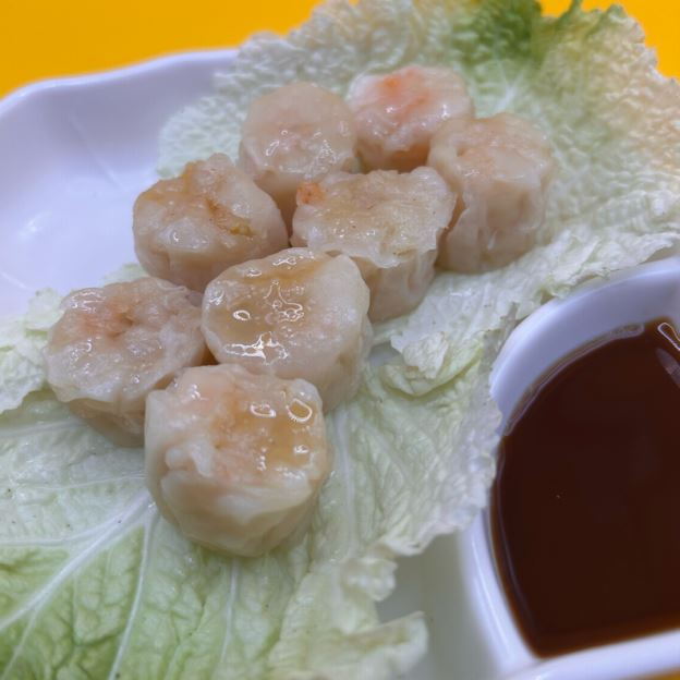 Steamed shrimp dumplings served with special sauce.