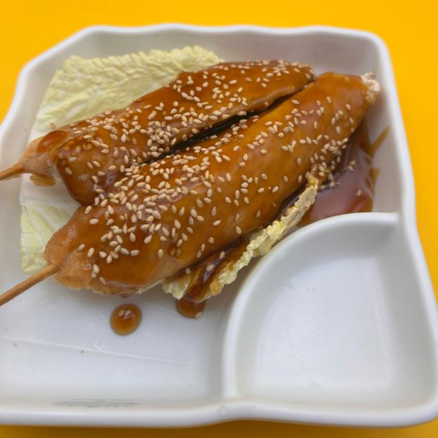 Skewered chicken topped with teriyaki sauce.