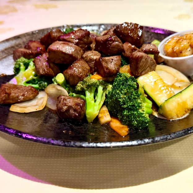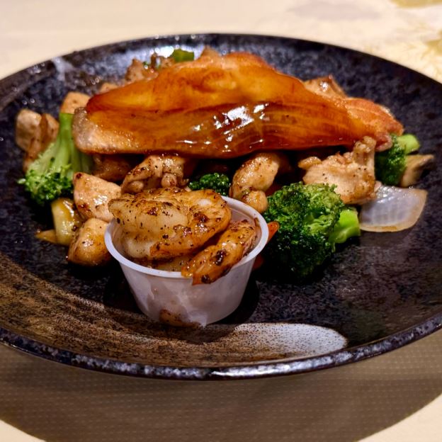 Teriyaki chicken, California Roll, fried Shu Mai, and ginger Salad.