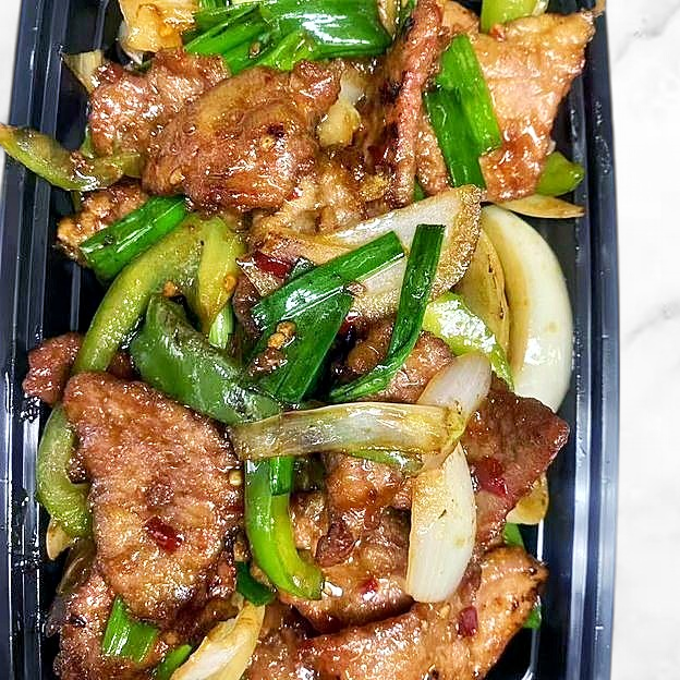 Sliced tender beef w. scallions & onions on traditional Mongolian sauce
