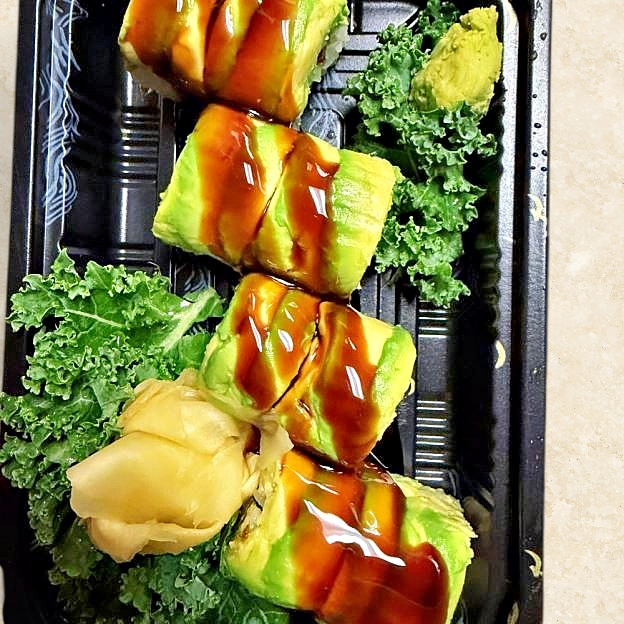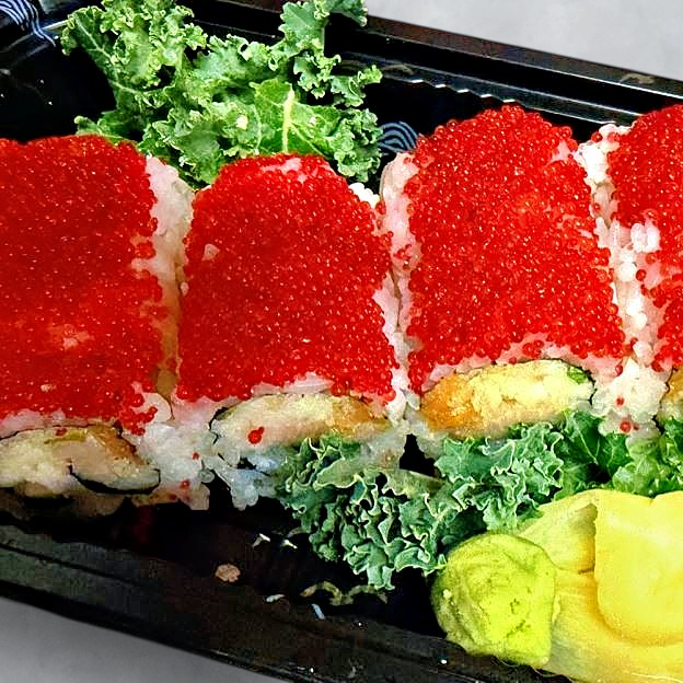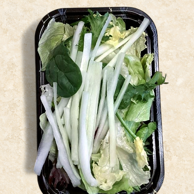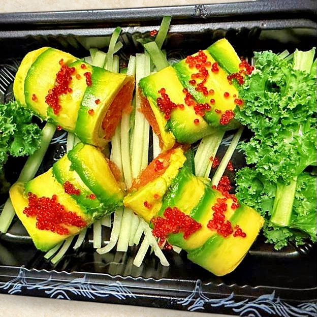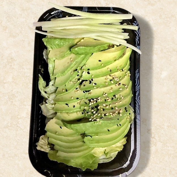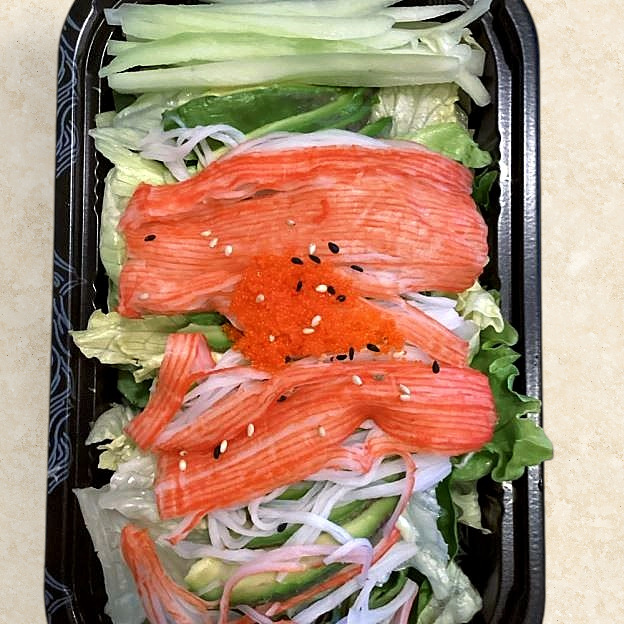 Sliced avocado, crab stick & masago in green salad with ginger dressing