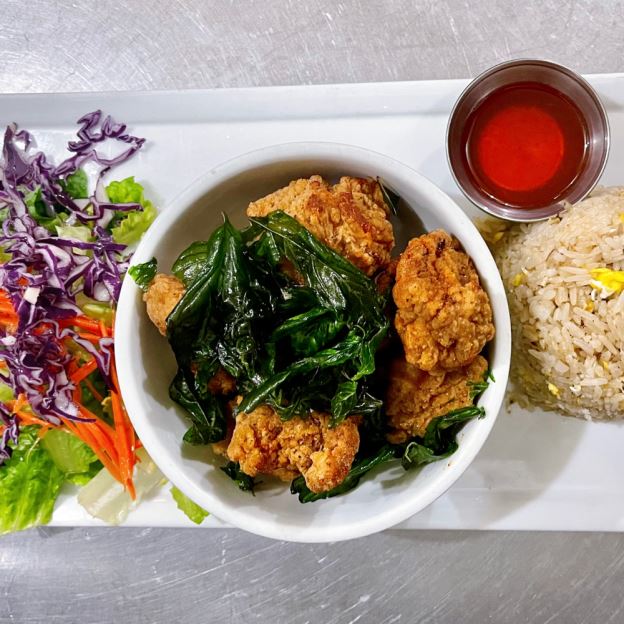 Taiwanese style Fried Chicken with egg fried rice and salad.