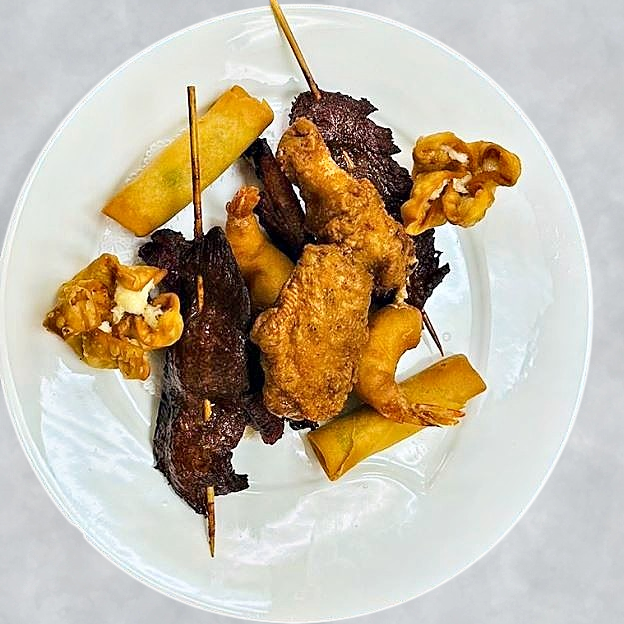 (2) Beef on Stick, (2) Spate Ribs, (2) Chicken Wings, (2) Fried Shrimp, (2) Crab Rangoon, (2) Spring Roll