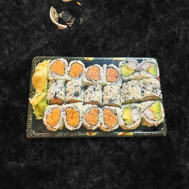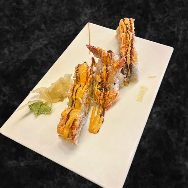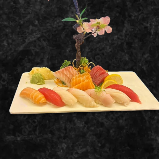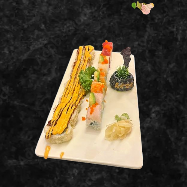 2 pc takoyaki, 4 pc pork or vegetable gyoza, 2 pc vegetable spring rolls, 4 pc shrimp tempura, 4 pcs soy garlic or spicy wings