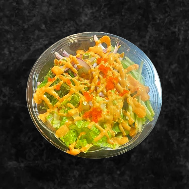 California roll, white rice, gyoza, green salad in ginger dressing and miso soup.