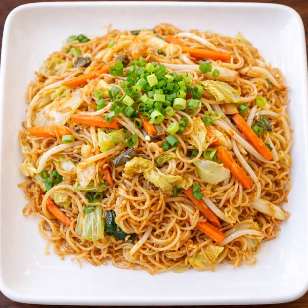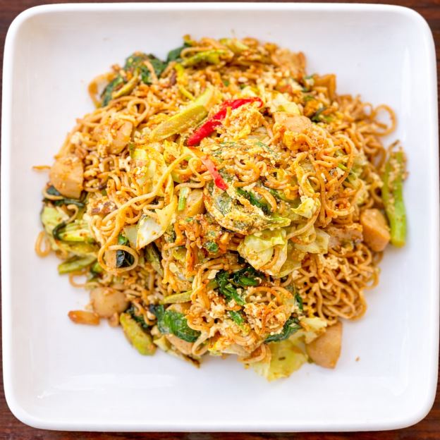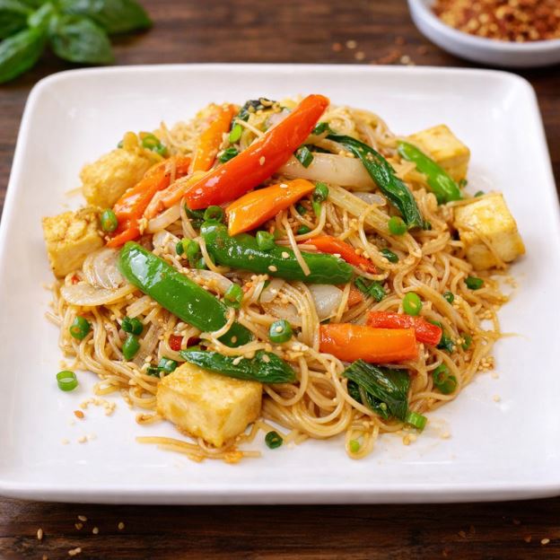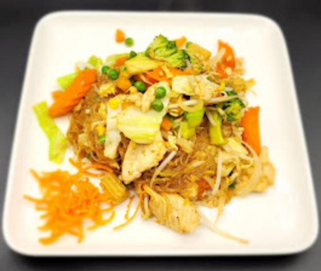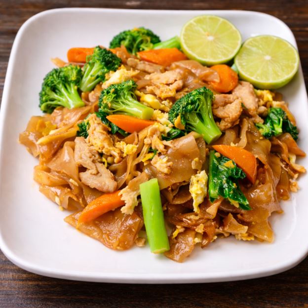 Stir fried spicy noodle, fresh basil with broccoli, carrot, onion, bell pepper, egg, straw mushrooms and bamboo shoots.