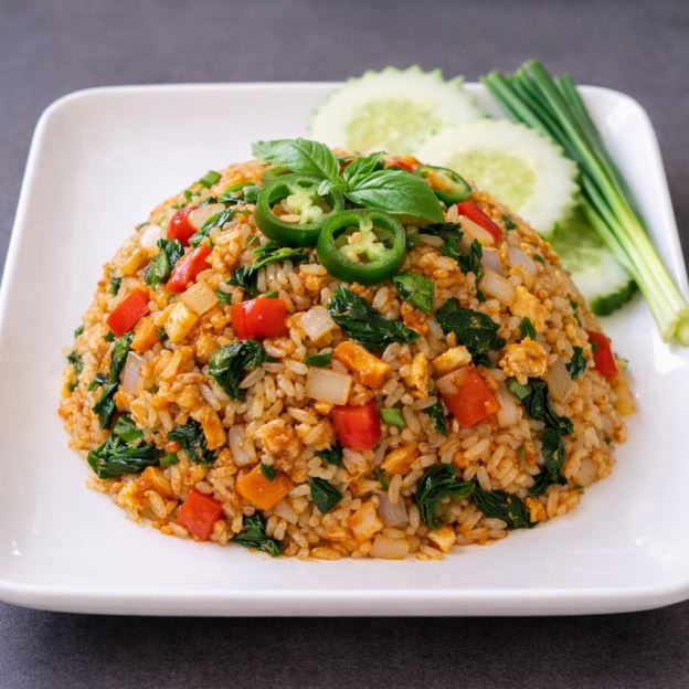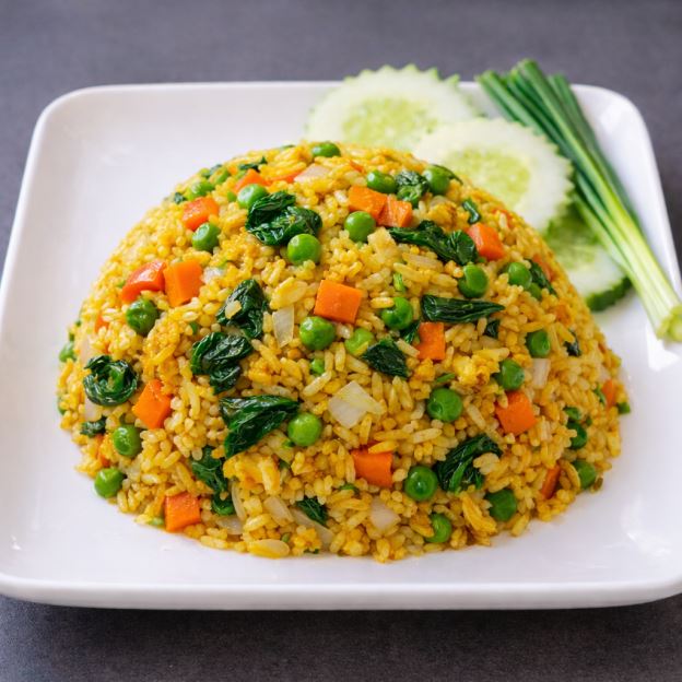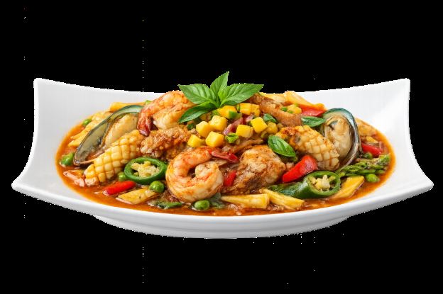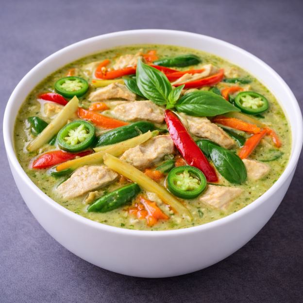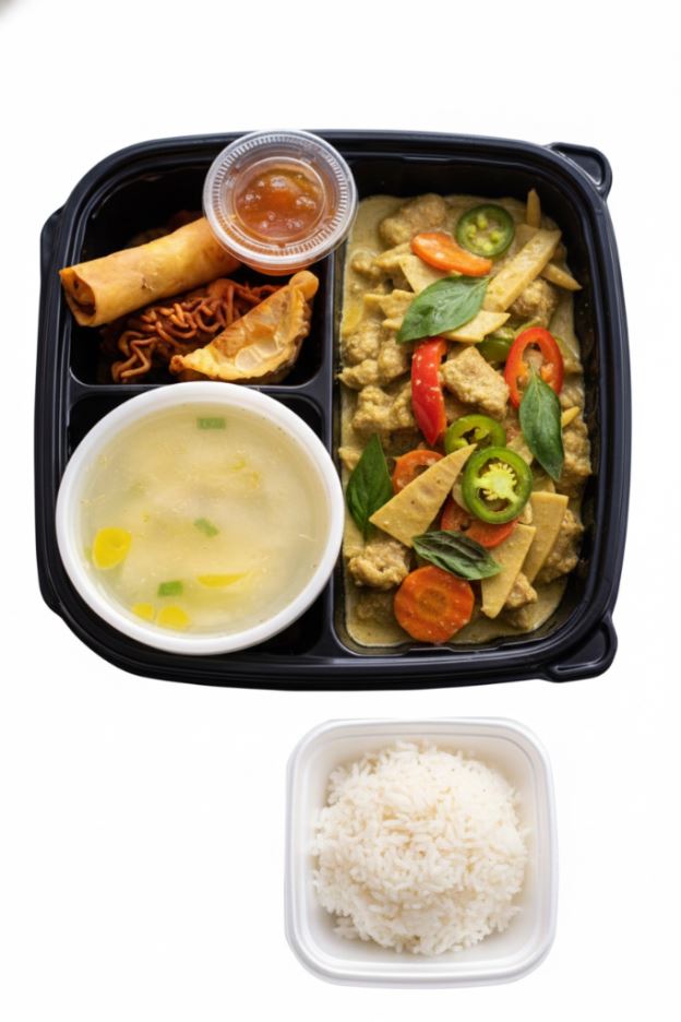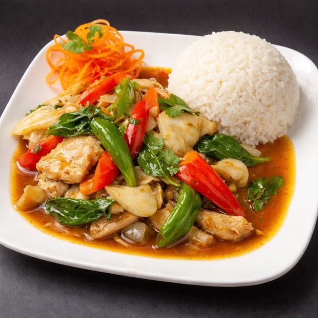 With coconut milk, bell pepper, bamboo shoot, peas and basil leaves. Served with steamed rice.