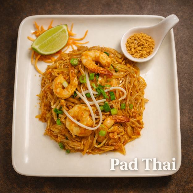 Thai rice noodles, bean sprout, green onion, egg and peanut.