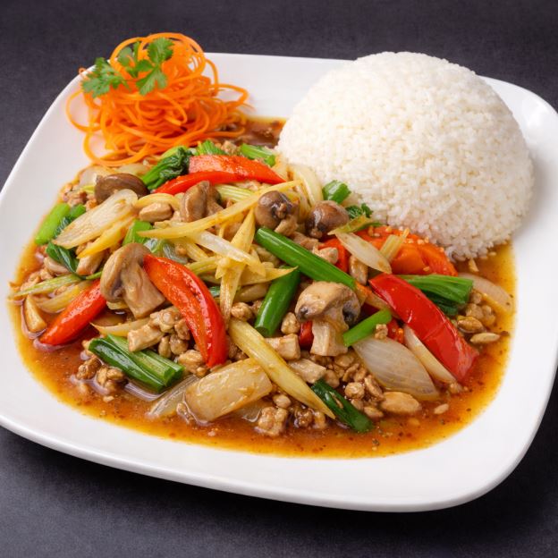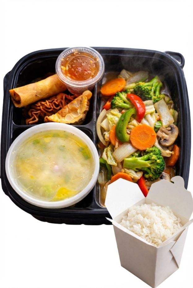 Stir friend choice of meat, fresh mixed vegetables. Served with steamed rice.