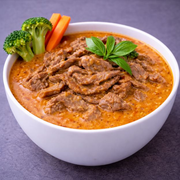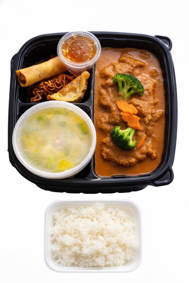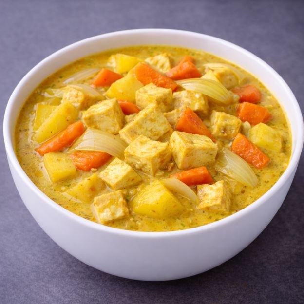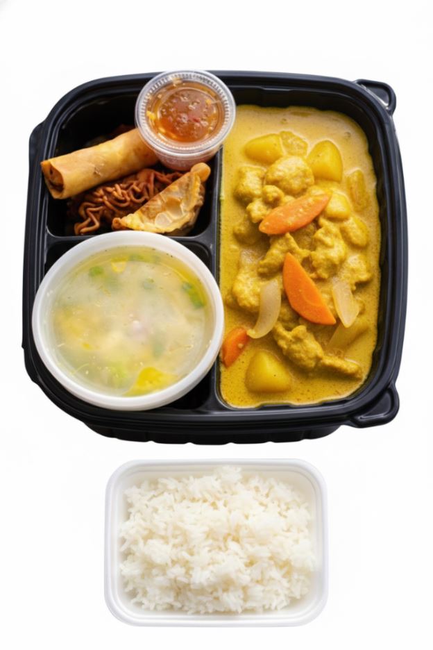 A curry simmered in coconut milk, potatoes, onions and carrots. Served with steamed rice.