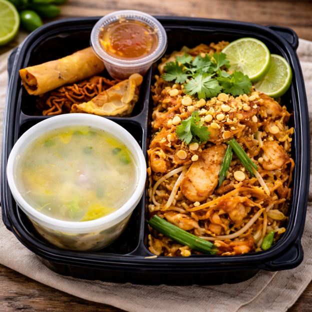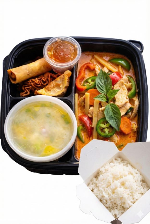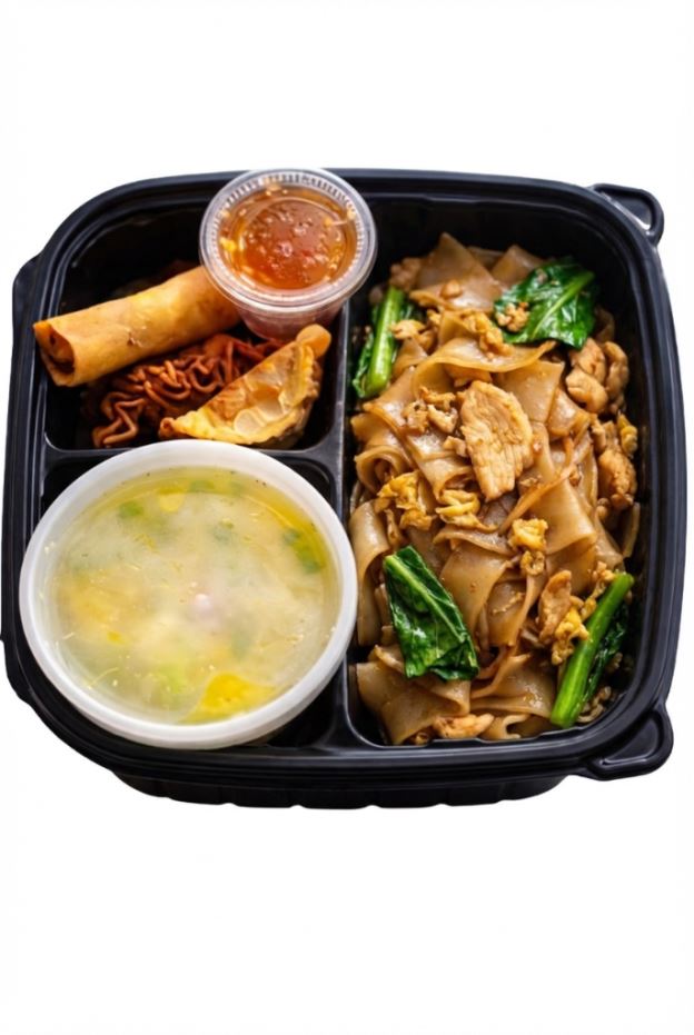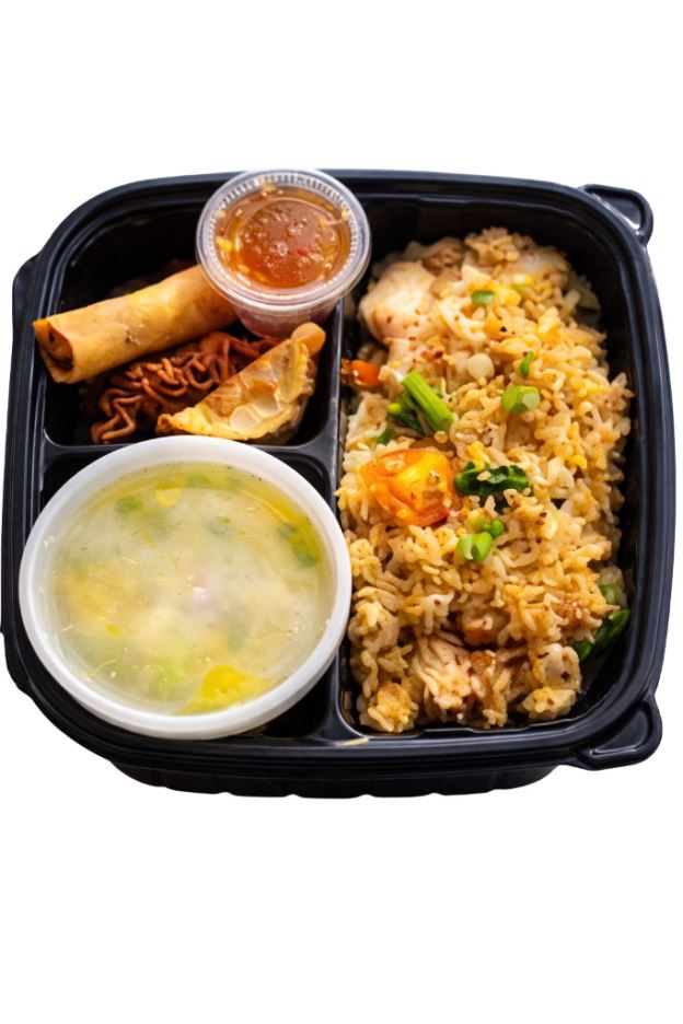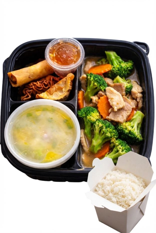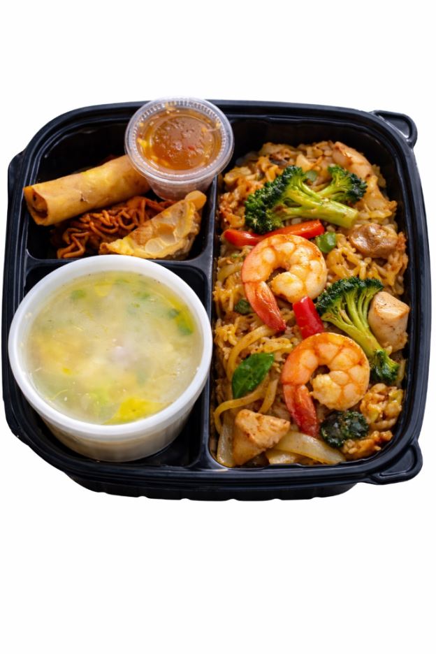Mon - Fri 11:00 am - 3:00 pm. Choose an ENTRÉE with your choice of Protein. Each set comes with 1 Veg Egg Roll, 1 Crab Rangoon, 1 Pot Sticker, and your choice of one of the following soups: Tom Yum Creamy, Egg Drop Soup, or Miso Soup. Served with Rice. Sub Brown Rice $2.50 Make your dish with Homemade style noodles $2.50.