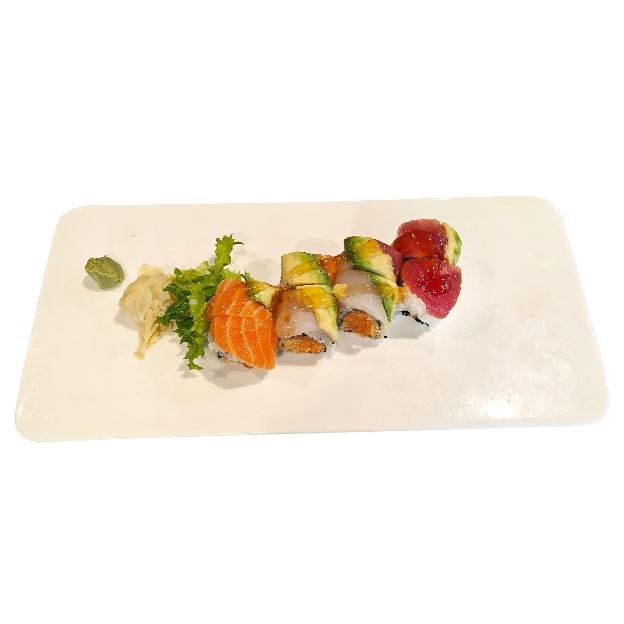 2 pcs sushi, 4 pcs sashimi, salmon teriyaki, shumai
