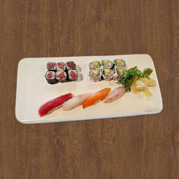 2 pcs sushi, 4 pcs sashimi, california roll, seaweed salad