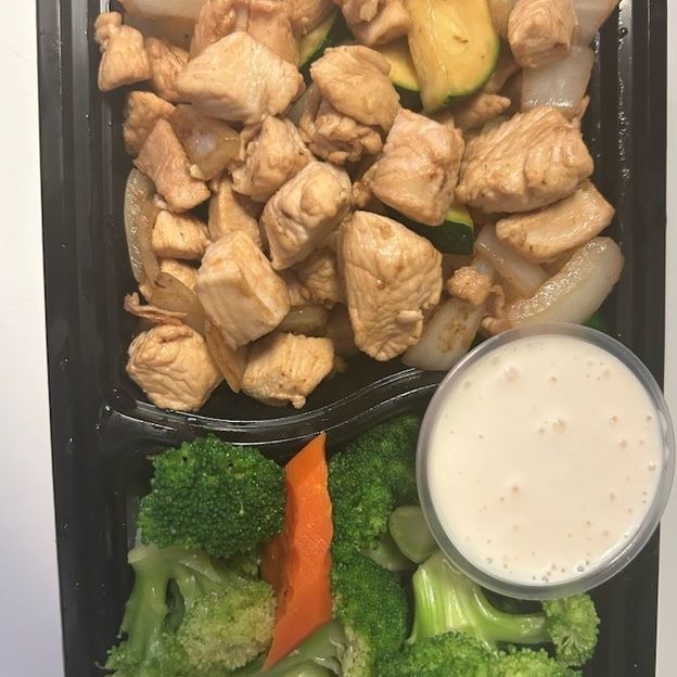 Jumbo shrimp, scallops, crab meat, squid, snow peas, carrot, water chestnut, green bell pepper, baby corn, napa cabbage, bamboo, and broccoli coated in a rich white sauce. Served with steamed white rice.