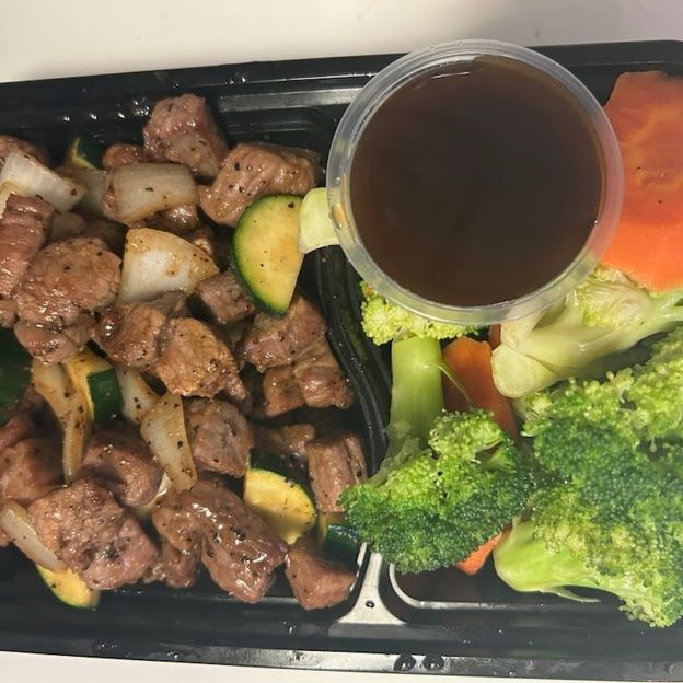 Stir-fried beef, white meat chicken, shrimp, green and white onion in a sweet garlic sauce. Served with steamed white rice.