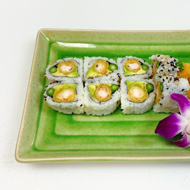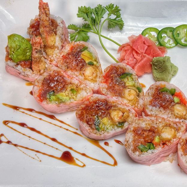 Tuna, masago, scallions and tempura flakes in a special spicy sauce topped with tobiko and quail egg.