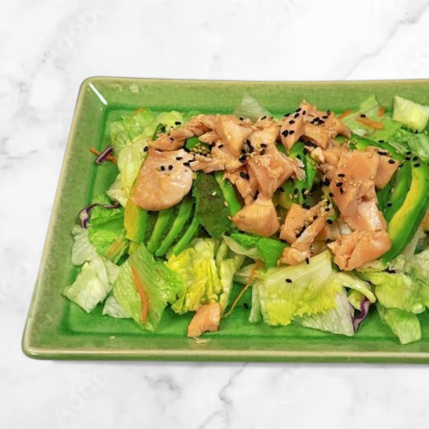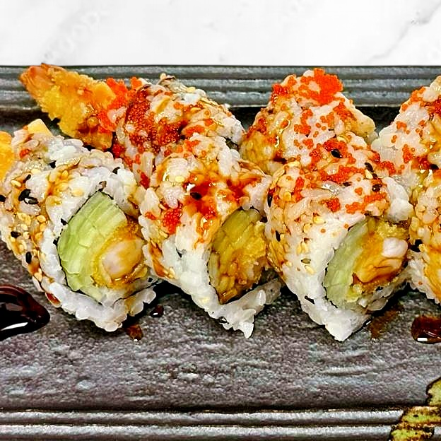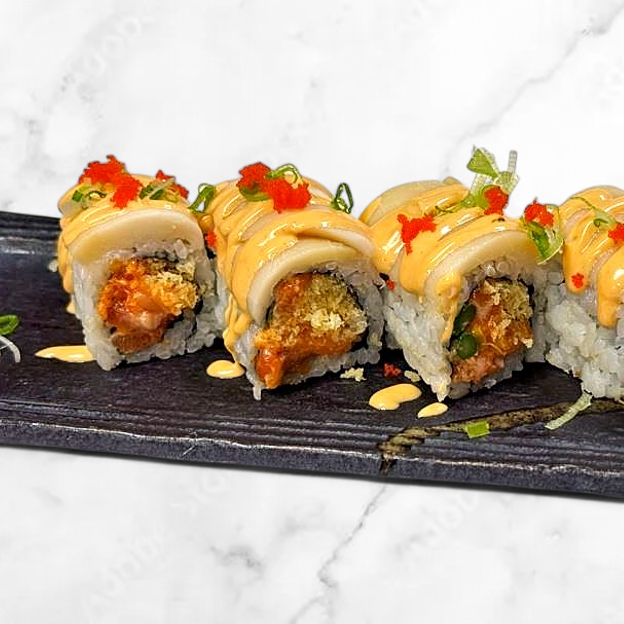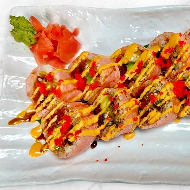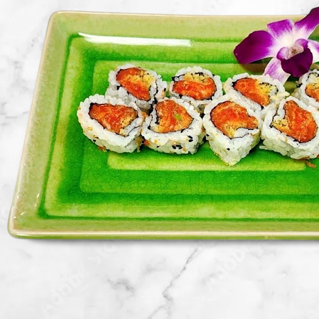 Salmon, masago. scallions and tempura flakes in a special spicy sauce topped with tobiko and quail egg.