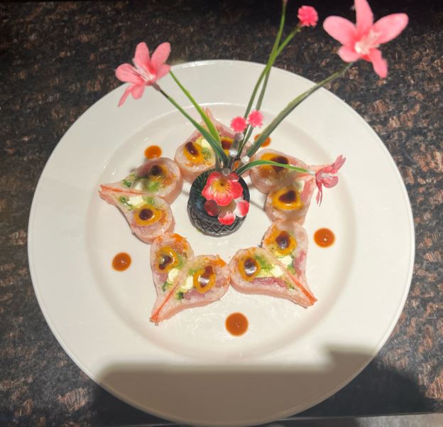 8 slices of fresh yellowtail and jalapeno with ponzu sauce.