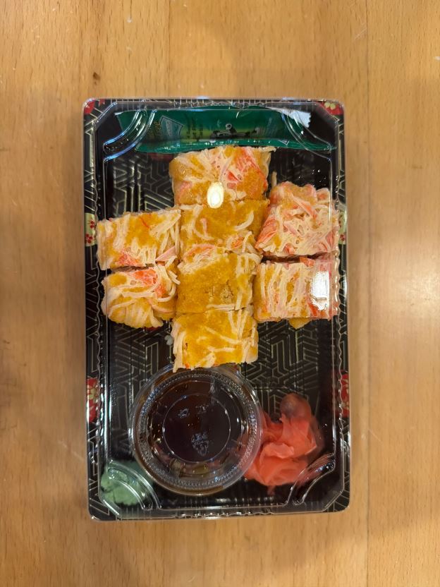Crabmeat, cucumber, spicy mayo and flying fish roe