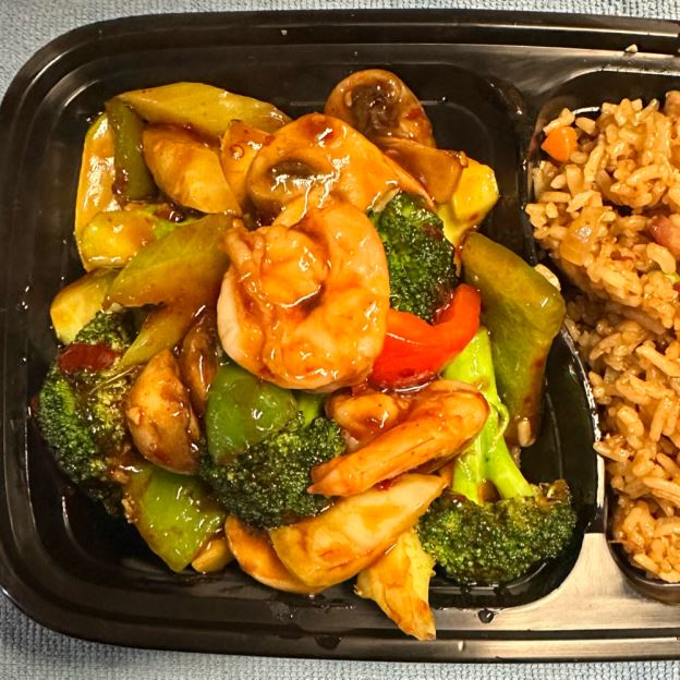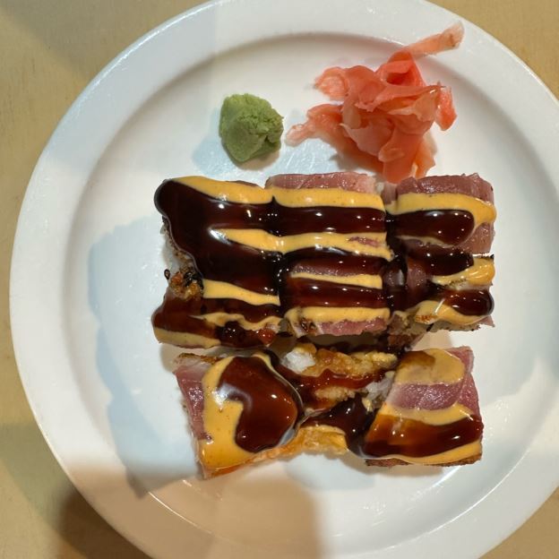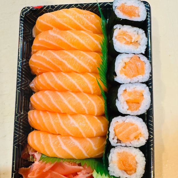 Four pieces of each tuna, salmon and roll. (Any regular roll). Served with miso soup or salad.