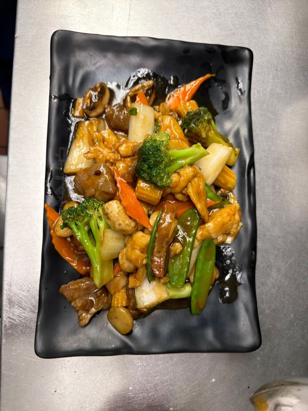 Chicken, shrimp and mixed vegetable with peanut sauce.