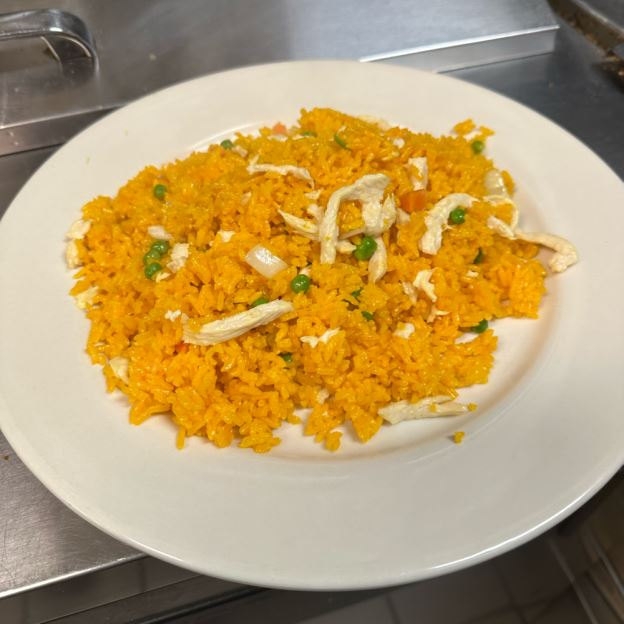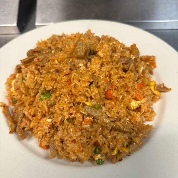 Spicy fried rice w. mixed seafood, onions, peppers
