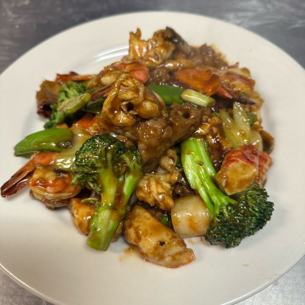 Jumbo shrimp, sliced chicken & scallop w. Broccoli Snow peas & string bean in our rich brown sauce