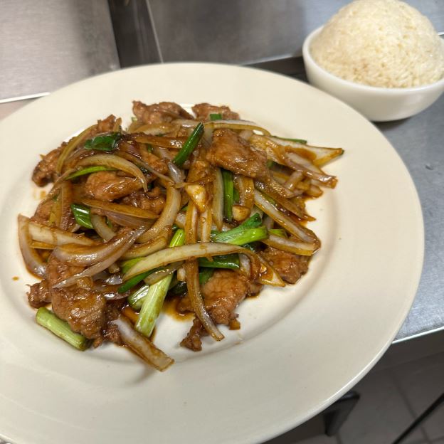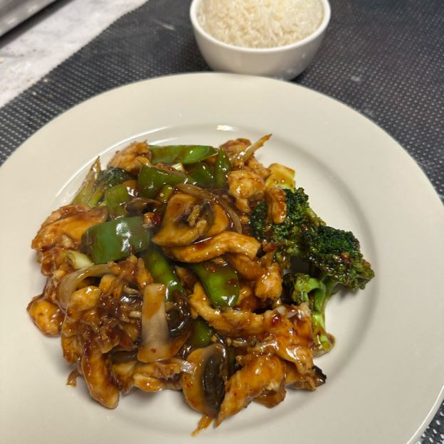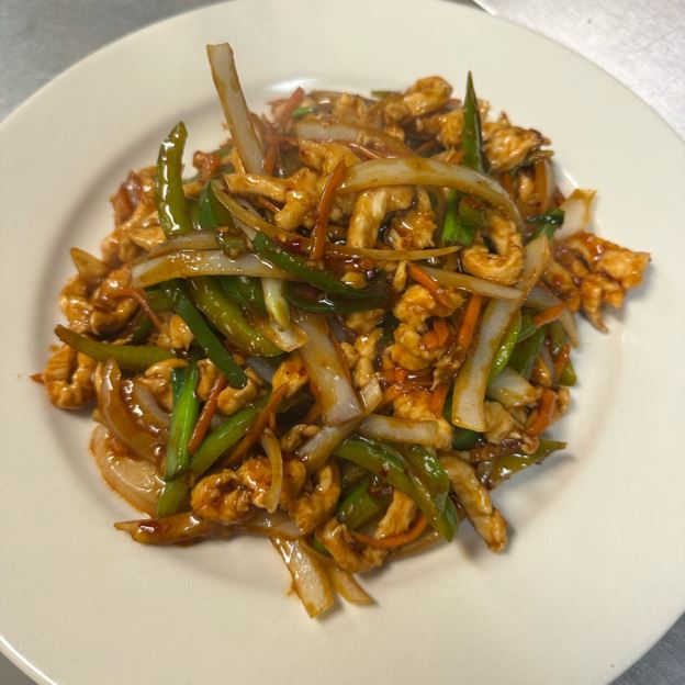 Name after its city of origin, Hunan, this dish combines strips of chicken breast & vegs. in the chefs special hot sauce