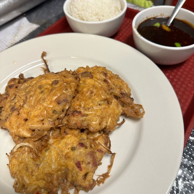 Sautéed baby shrimp w chili sauce on the side & shredded beef w black sauce on other side