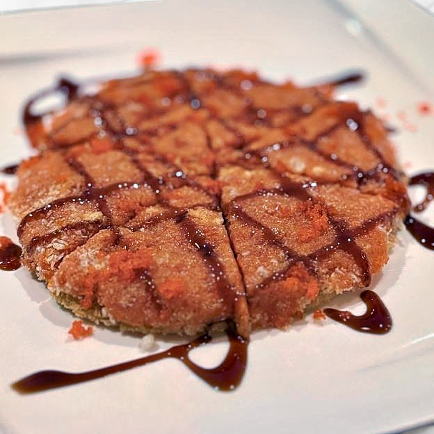Toasted salmon skin with seaweed, cucumber, salmon roe & vinegar sauce.