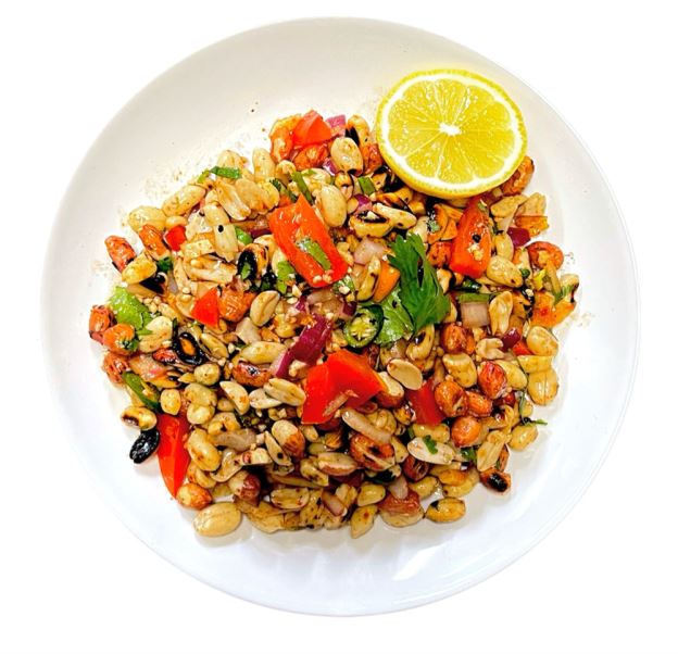 Fried peanuts mixed with a tangy and spicy onion-tomato and cilantro.
