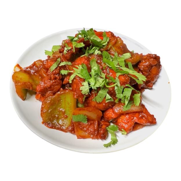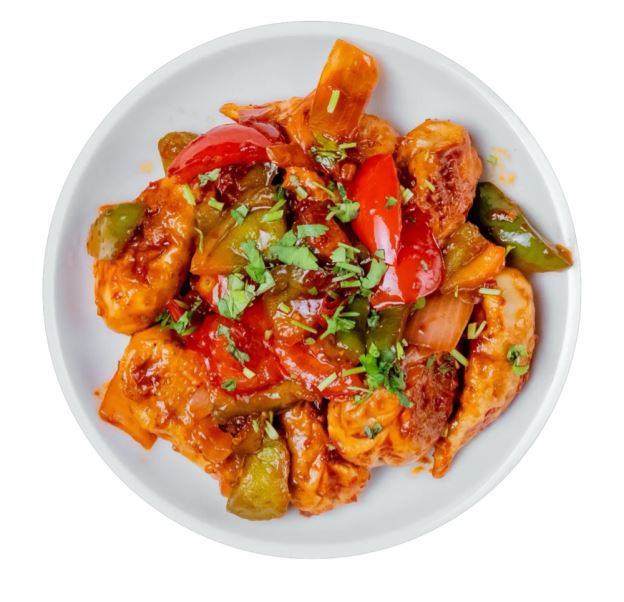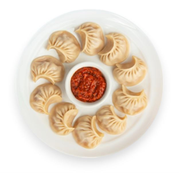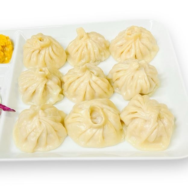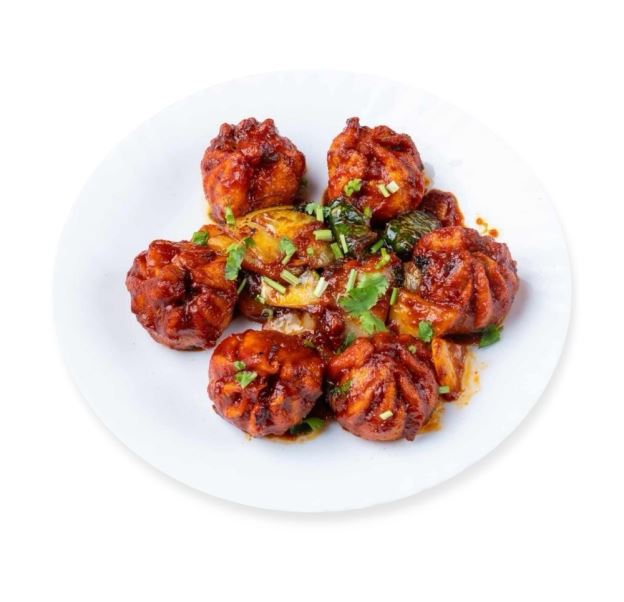 Deep Fried Chicken MoMo, enriched with hot & spicy sauce, onion, tomato & bell paper.
