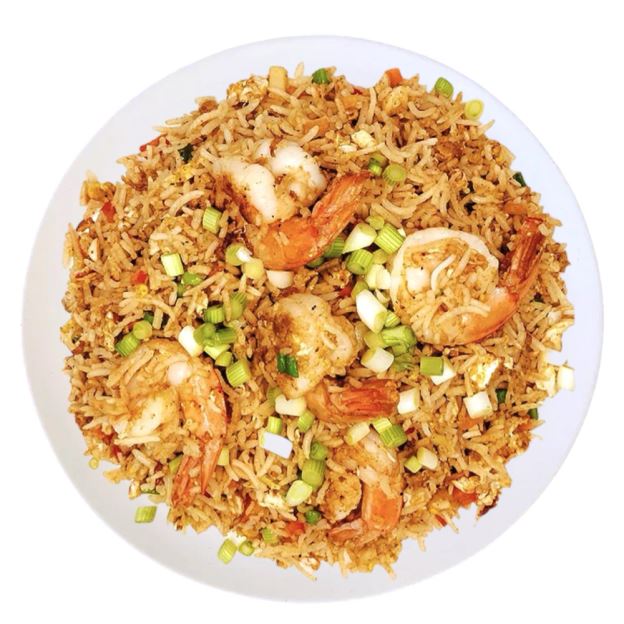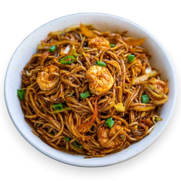 Stir-fried noodles with shrimp,season with vegetables and spices.