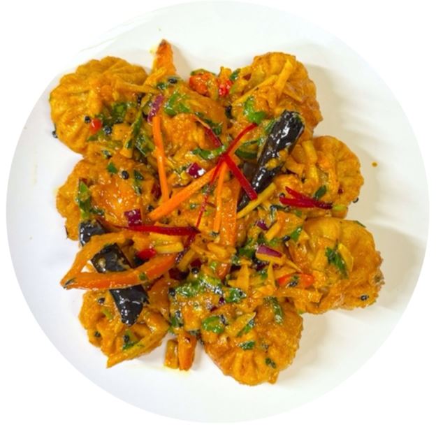 Deep Fried Veg. MoMo, enriched with hot & spicy sauce, onion ,tomato & bell paper.