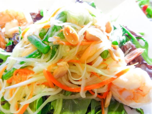 Som-tum. Papaya with green bean, carrot, tomato, peanut, garlic, boiled prawns, lime dressing.