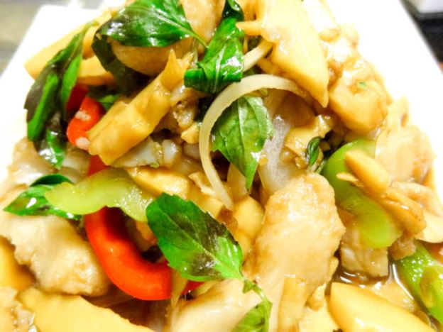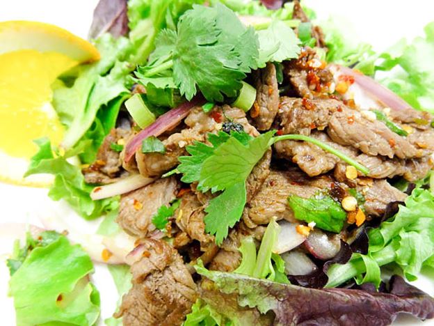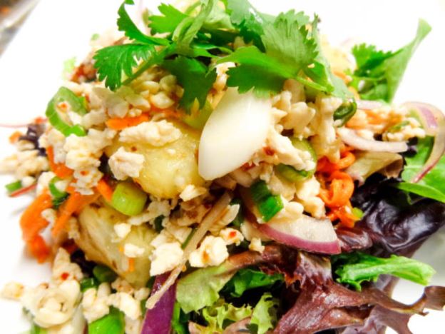 Minced chicken cooked in roasted rice powder, lime dressing, cilantro, red and green onion.
