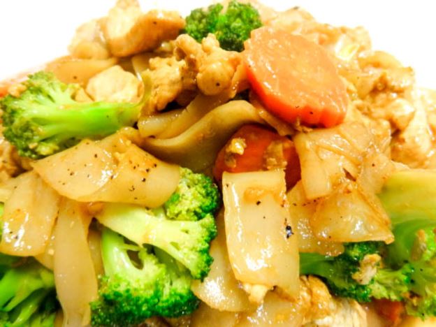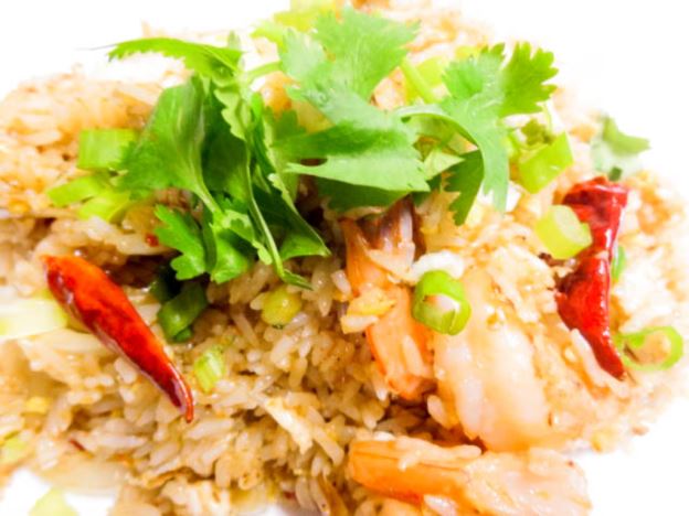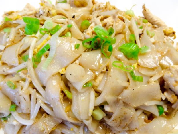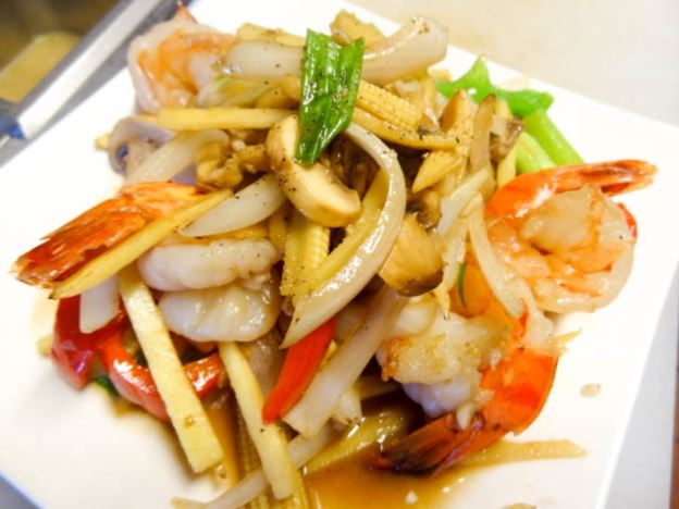 Silver noodle, prawn, calamari, carrot, green and red onion, cilantro with lime dressing.